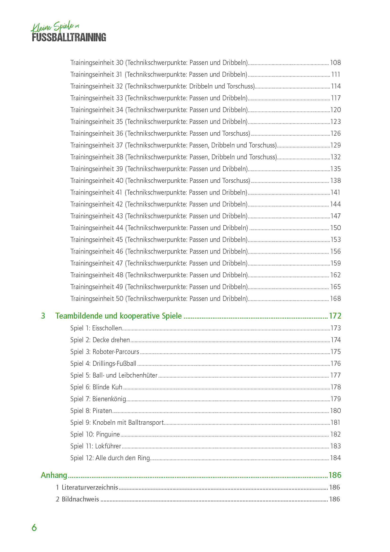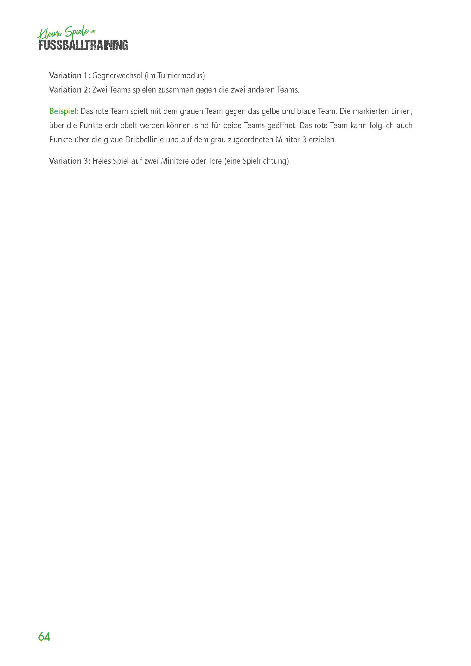 Kleine Spiele im Fußballtraining – 150 kreative Spielformen für Technik- und Taktiktraining ist ein Praxishandbuch für alle Kinder- und Jugendtrainer, in dem 150 motivierende und kognitiv aktivierende Spielformen vorgestellt werden. Alle Spiele sind thematisch als Trainingseinheiten in Aufwärmspiele, Hauptteile und Abschlussspiele gegliedert. Sie stellen somit immer eine strukturierte Trainingseinheit dar, wodurch eine sofortige Anwendung im eigenen Training möglich ist. Das Alleinstellungsmerkmal dieses Buches ist, dass alle Trainingseinheiten einen inhaltlichen und organisatorischen roten Faden aufweisen, welcher es ermöglicht, das Training fortlaufend durchzuführen. Die Basis aller Spielformen sind die 11 Spielleitlinien, welche im ersten Buch Kleine Spiele im Fußballtraining (erschienen 2022) publiziert wurden.