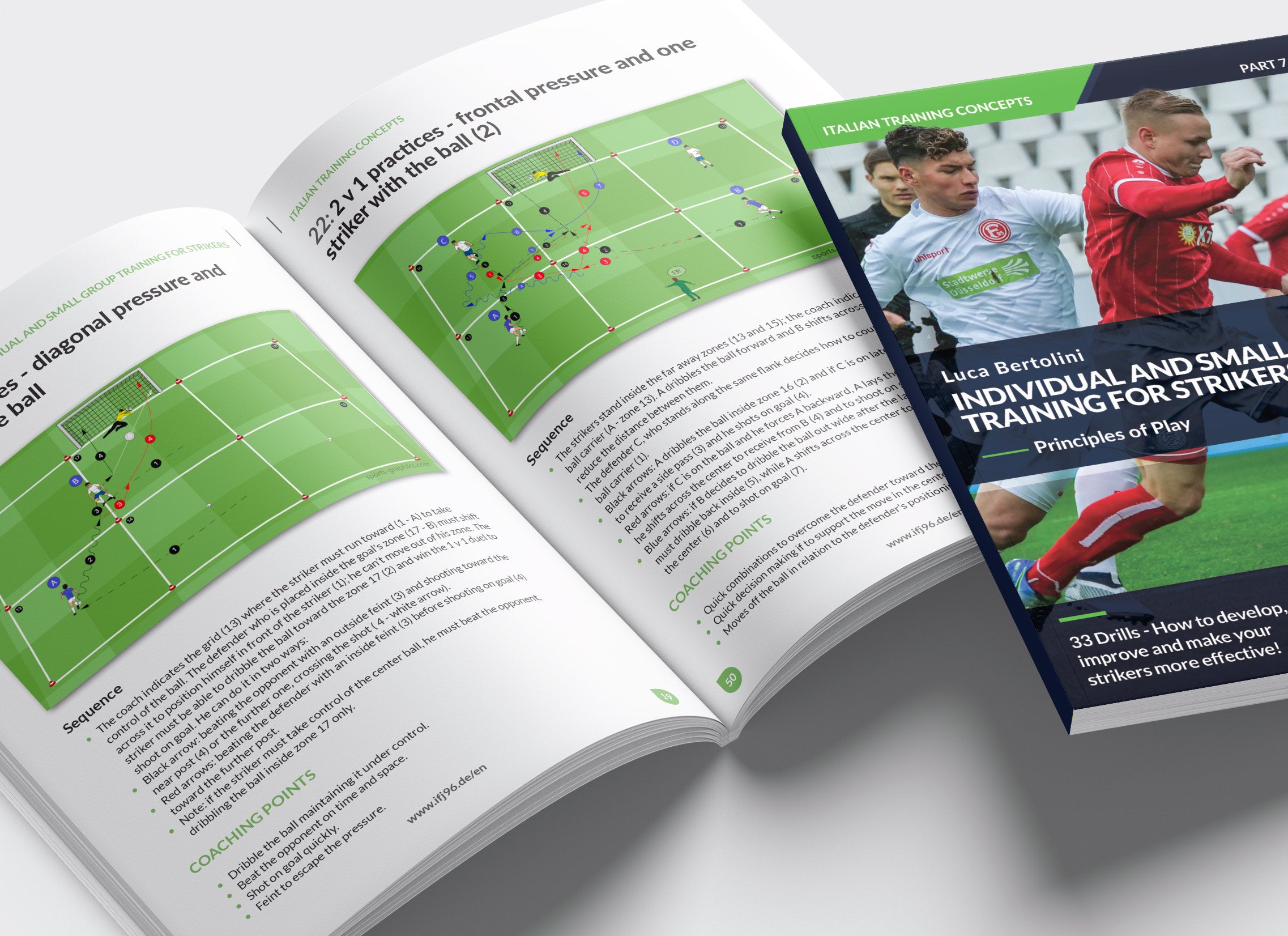 This book has the goal to coach the strikers from an individual point of view, involving him in 1 v 1 + goalkeeper situations to improve their skills and to let them learn the basic tactical principles of play and to coach them in cooperating with teammates and against more than one defender (numerical advantage and disadvantage situations). This is the summary of the situations of play that the practices aim to coach: