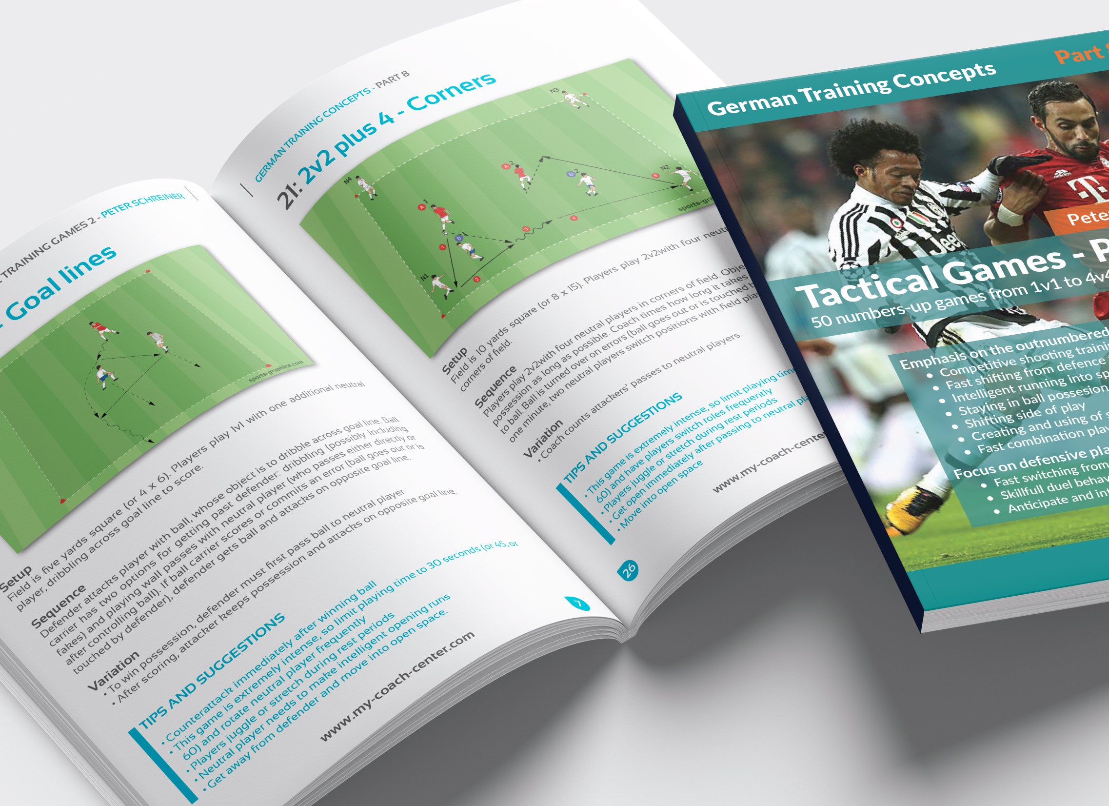 The second part of the “Tactical Games” is about position games with neutral players from 1 against 1 to 4 against 4, vary the number of “Jokers” and their position inside and outside the field. Help the players getting as many chances to score and then use them perfectly. With the tactical games of this book the following focal points can be coached: