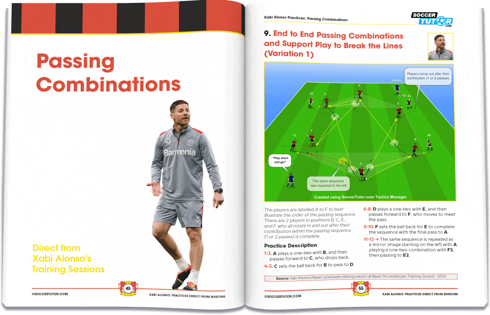 Es enthält 82 originale Übungen aus den Trainingseinheiten zwischen 2022 und 2024 sowie über 30 Seiten taktische Analyse. Du lernst, wie Alonso sein Team befähigt, den Ballbesitz zu dominieren, den Spielaufbau mit variablen Formationen (4-2-4, 3-2-5, 2-3-5) zu gestalten und durch präzises Positionsspiel sowie Rotationen Überzahlsituationen zu schaffen.