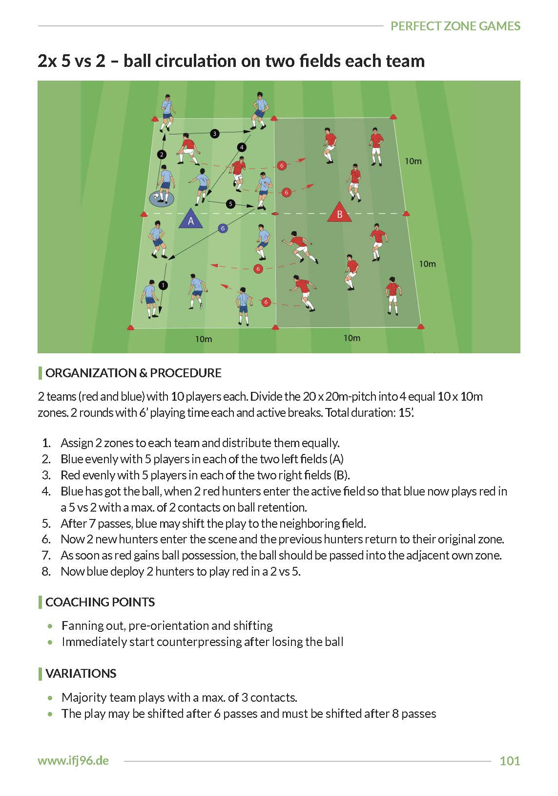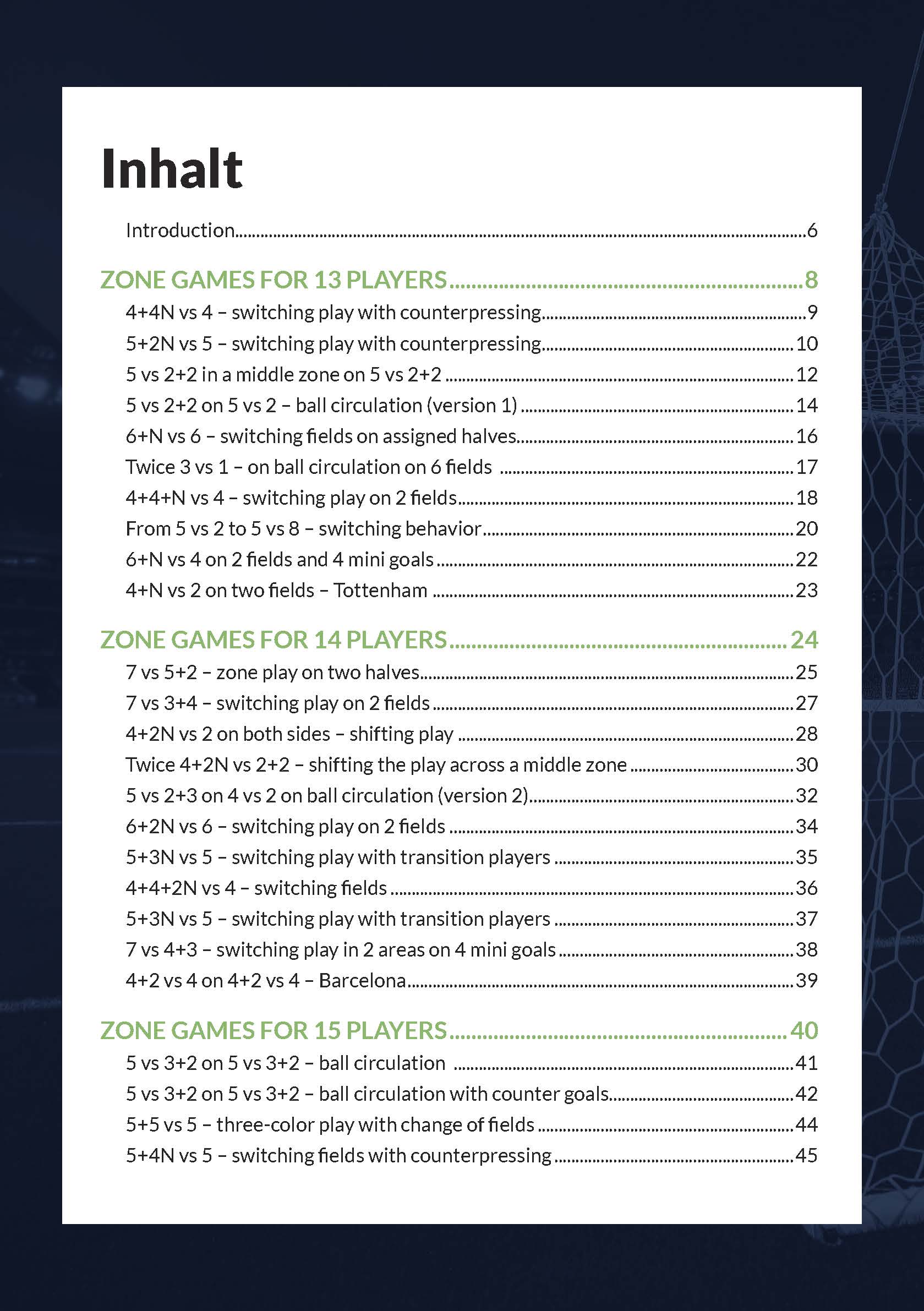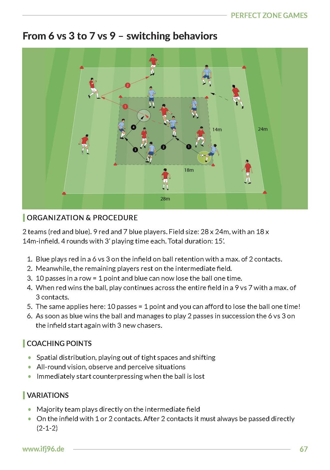 Zone games train all four phases of football (own possession, transition after losing the ball, opponent’s possession, and transition after winning the ball). They develop not only game intelligence and possession play, but also the behavior in overload, equal, and underload situations. In addition, they promote transition play, switches of play, counter-pressing after losing the ball, and optimal occupation of space after regaining possession.