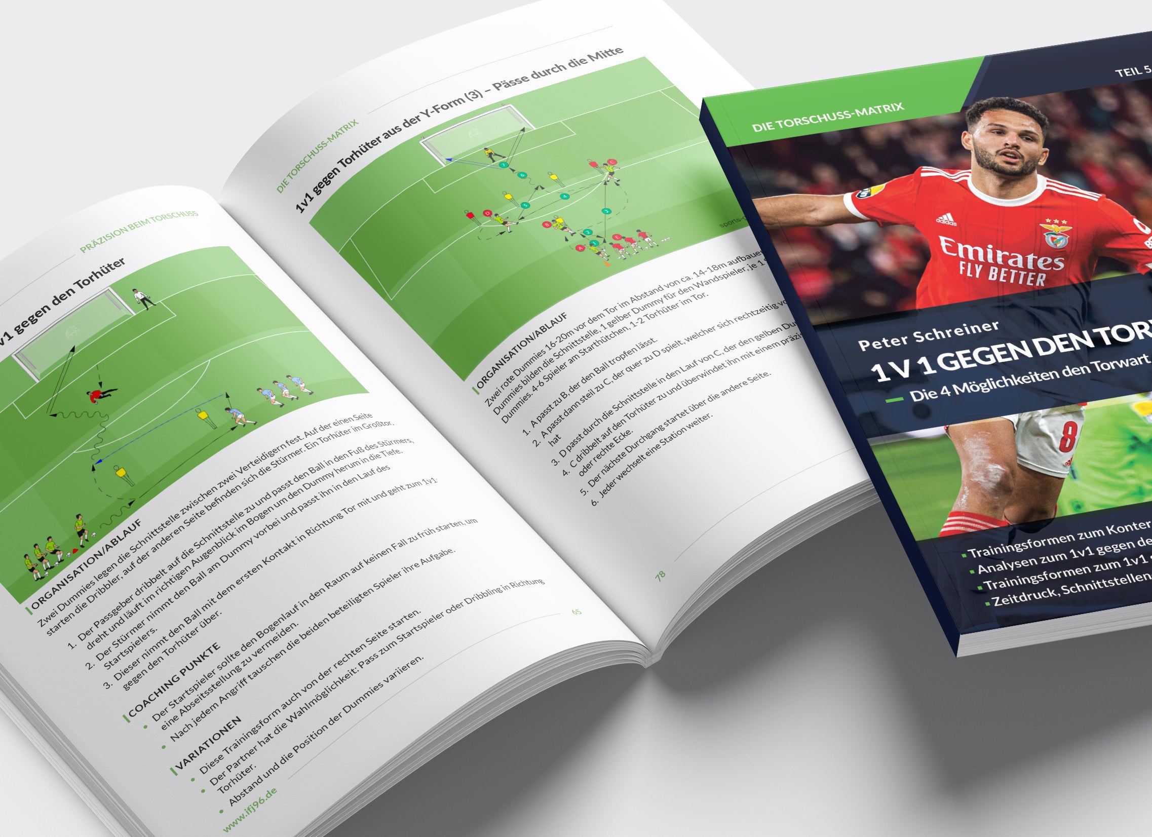 Das Buch „1 v 1 gegen den Torwart“ von Peter Schreiner (99 Seiten, 38 Grafiken, 64 Fotos) ist der fünfte Teil der „Torschuss-Matrix“ und konzentriert sich auf die entscheidende Spielsituation 1 gegen 1 mit dem Torhüter. Ziel ist es, Stürmer systematisch auf diese Hochdrucksituationen vorzubereiten und ihnen das nötige Selbstvertrauen zu vermitteln, um Großchancen im Pflichtspiel erfolgreich zu verwerten.