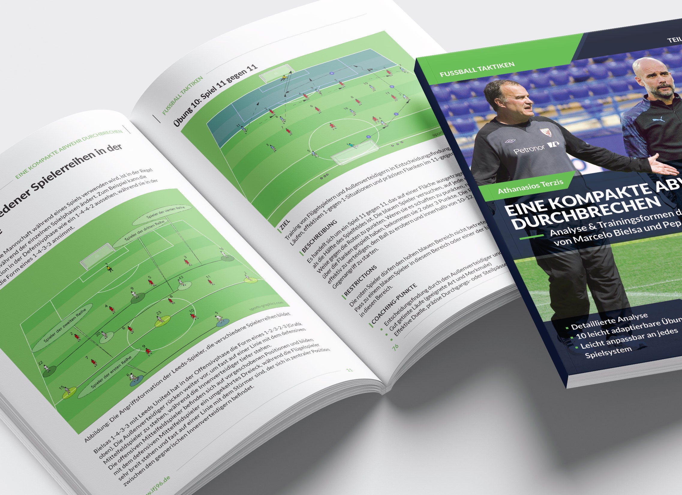 Im Buch „Eine kompakte Abwehr durchbrechen“ von Athanasios Terzis lernst du, wie Toptrainer wie Marcelo Bielsa und Pep Guardiola enge Defensivblöcke systematisch knacken.