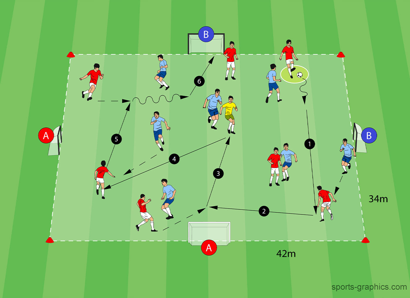 Um dies im Training spielnah abzubilden, bieten sich besonders Positionsspiele an. Alle 4 Phasen des Fußballspiels (eigener Ballbesitz, Umschaltverhalten bei Ballverlust, gegnerischer Ballbesitz und Umschaltverhalten bei Ballgewinn) können geschult und spielnah trainiert werden.