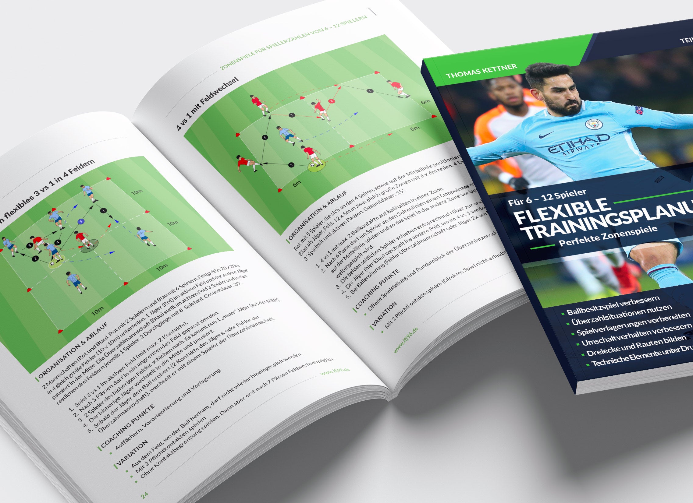 Der fünfte Teil der Heftreihe „Flexible Trainingsplanung“ befasst sich mit dem Thema „Zonenspiele für Spielerzahlen von 6 – 12 Spielern“. Wir Trainer kennen alle die Herausforderung einen tief und kompakt stehenden Gegner zu bespielen. Der Zeit- und Raumdruck in der gegnerischen Hälfte wird in Richtung gegnerisches Tor immer größer. Möchte man sich hier nicht nur auf hohe Bälle, Flanken und Standardsituationen verlassen, ist ein flexibler, aber stets kontrollierter Spielaufbau gefragt, um Räume durch Spielverlagerungen, sowie ein variables Angriffsspiel zu schaffen.