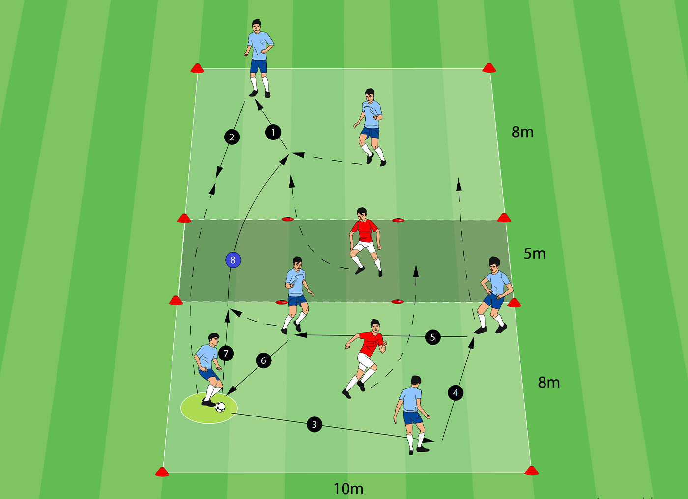 Um dies im Training spielnah abzubilden, bieten sich Zonenspiele an. Zonenspiele sind Ballbesitzspiele in Gleich-, Über- oder auch Unterzahl mit mehreren Spielfeldzonen. Diese fördern die Fähigkeit, den Ball unter Raum- und Zeitdruck in verfügbare Räume optimal zu nutzen und den Ball den eigenen Reihen zirkulieren zu lassen, um den richtigen Zeitpunkt für eine Spielverlagerung, bzw. einen Durchbruch zu erreichen.
