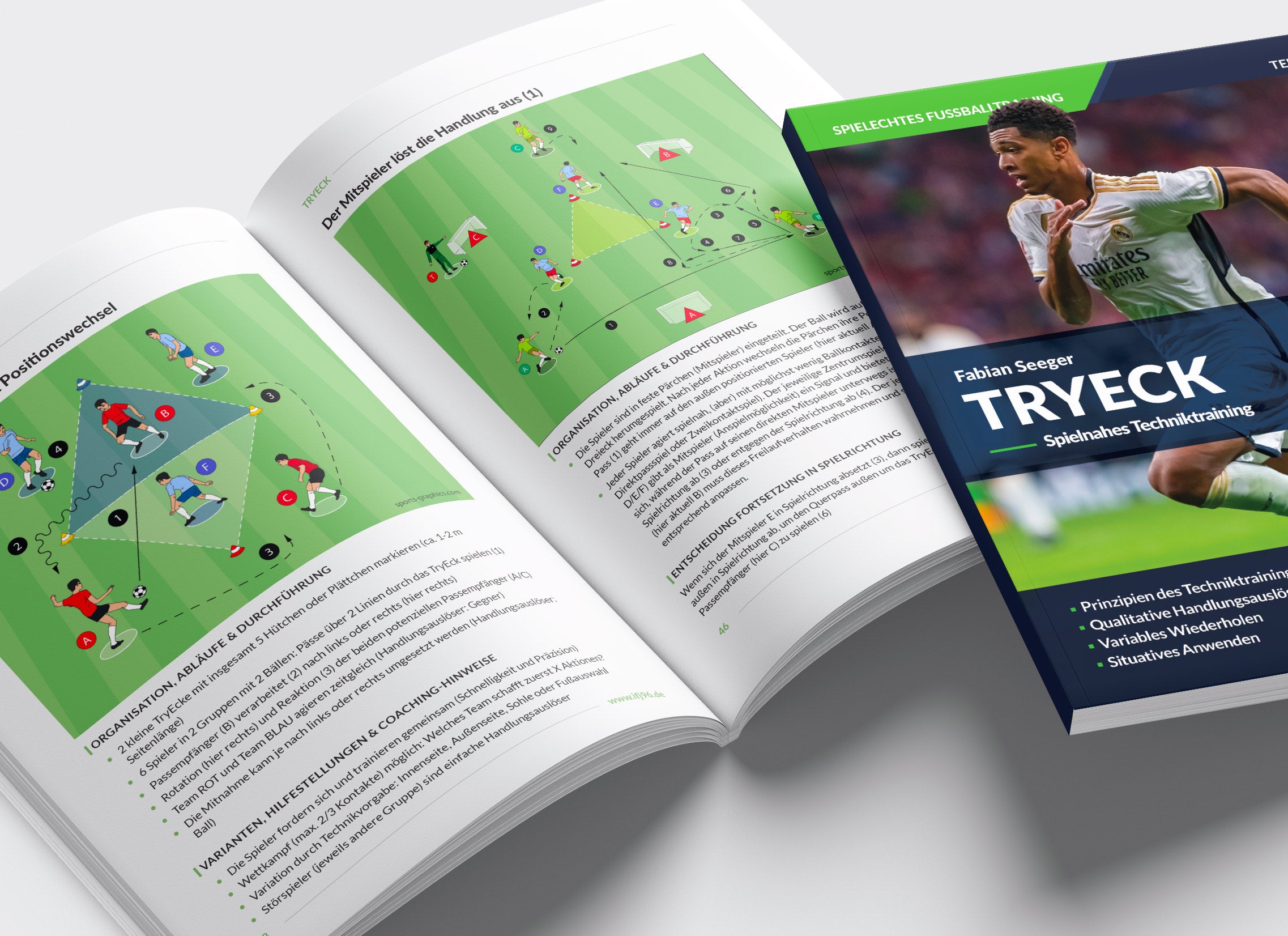 Das TRYECK – Spielnahes Techniktraining Buch von Fabian Seeger bietet auf 58 Seiten mit 23 Trainingsformen einen modernen Ansatz für technikorientiertes Fußballtraining von der U11 bis zum Profiniveau.