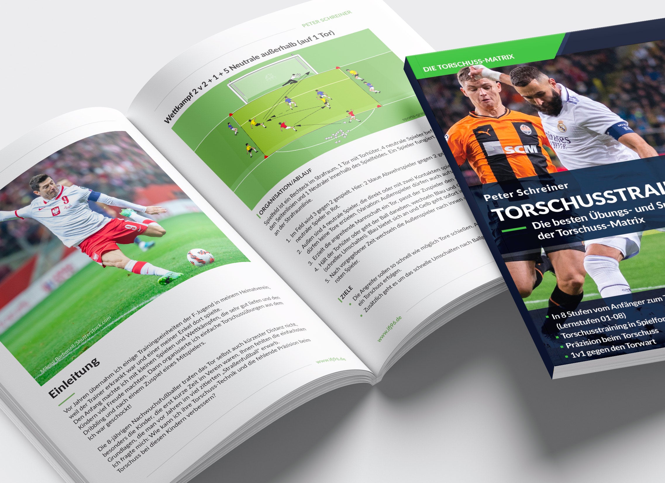 Das eBook enthält eine Auswahl an Übungs‑ und Spielformen, die direkt im Training umgesetzt werden können – vom Torschuss nach Zuspiel, über Kombinationen im Strafraum bis hin zu intensiven Wettkampfformen wie 2‑gegen‑1 oder 4‑gegen‑4 auf zwei Tore.