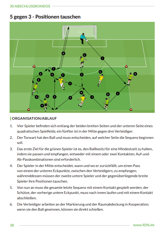 Im Fokus stehen die fünf Spielprinzipien der Angriffsphase – Durchdringung, Tiefe & Unterstützung, Bewegung, Breite und Improvisation – und wie sie in realitätsnahen Übungsformen trainiert werden können. Jede Rondo-Variante verbindet technische Anforderungen mit taktischen Entscheidungen und fördert damit ein Spielverständnis, das direkt auf den Platz übertragbar ist.