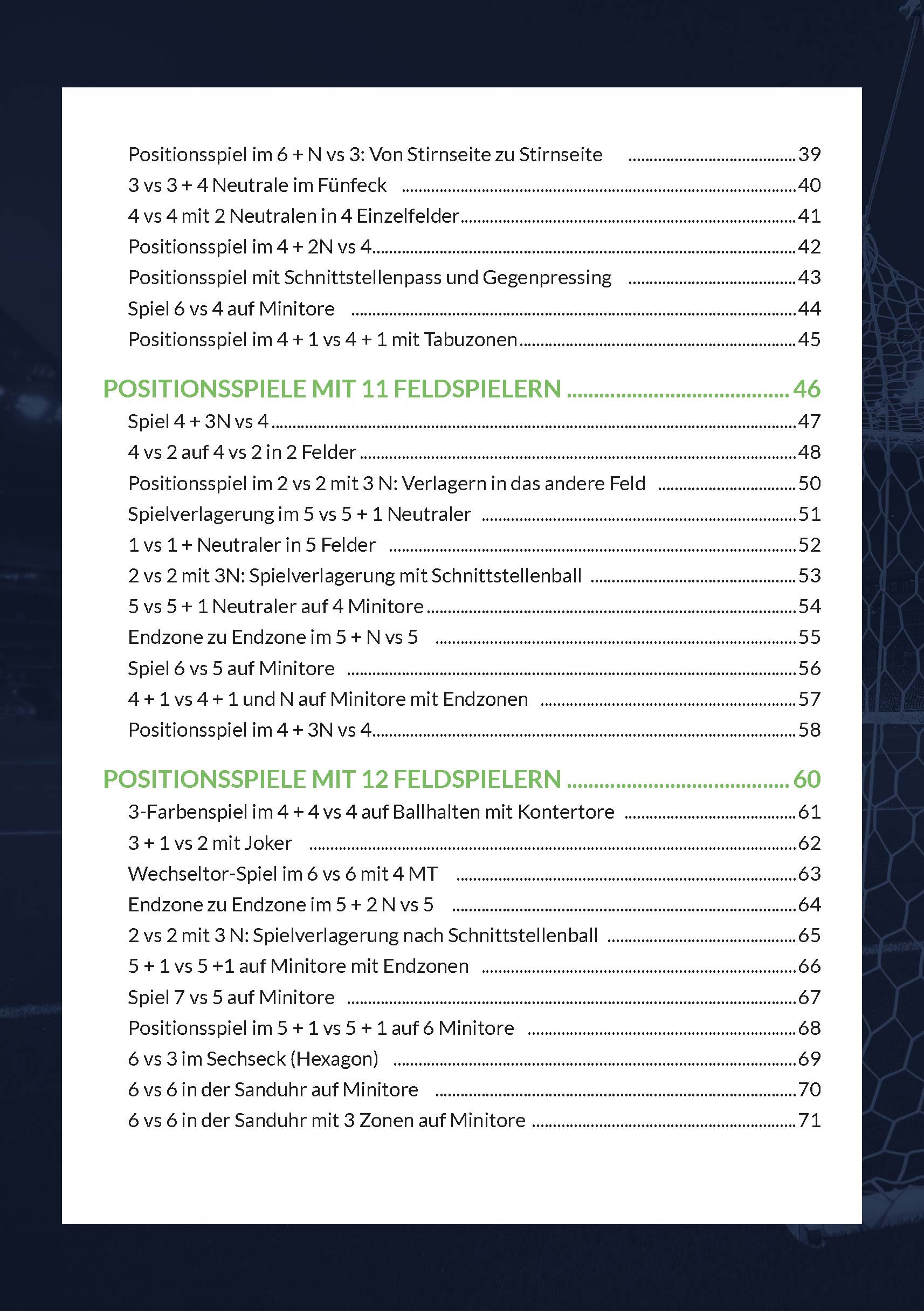 Diese fördern neben der Spielintelligenz und des Ballbesitzspiels auch das Verhalten bei Über-, Gleich- und Unterzahl-Situationen. Zudem wird auch das Umschaltverhalten, wie das Gegenpressing nach Ballverlust und das optimale Besetzen der Räume nach Ballgewinn trainiert.