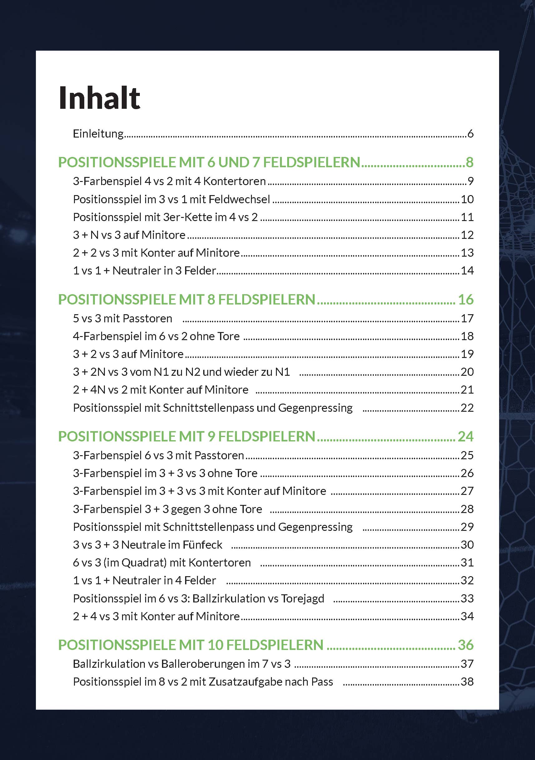 Um dies im Training spielnah abzubilden, bieten sich besonders Positionsspiele an. Positionsspiele sind Ballbesitzspiele in Gleich-, Über- oder auch Unterzahl ohne Tore. Diese fördern die Fähigkeit, den Ball unter Raum- und Zeitdruck verfügbare Räume optimal zu nutzen und den Ball den eigenen Reihen zirkulieren zu lassen. Demgegenüber versucht das andere Team entsprechend, Räume zu verknappen und Druck auszuüben, um selbst in Ballbesitz zu gelangen.