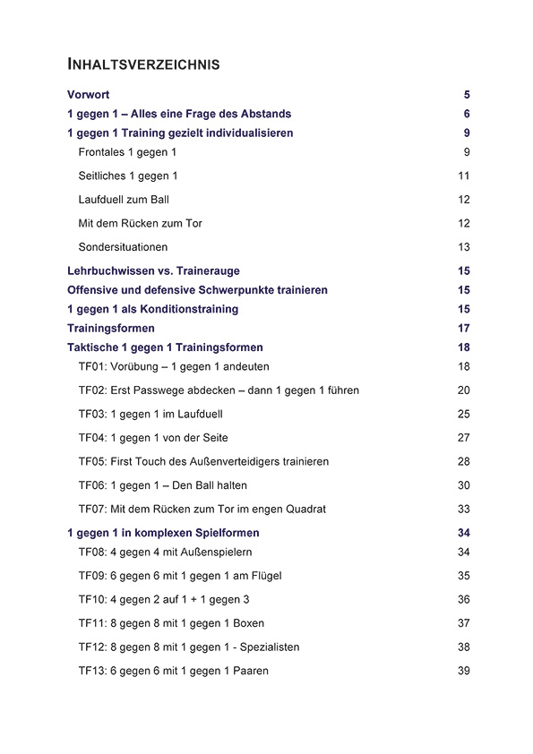In „Spiele im 1 gegen 1 entscheiden“ beschreibt er unter-schiedliche Situationen im 1 gegen 1. Darüber hinaus liefert er für jede Situation Coaching Tipps für Angreifer und Verteidiger – für Steven Turek ein weiterer Grundsatz „Immer Angreifer und Verteidiger coachen!“. Außerdem beschreibt er, wie Trainingsformen zum 1 gegen 1 effektiv als Konditionstraining genutzt werden können.