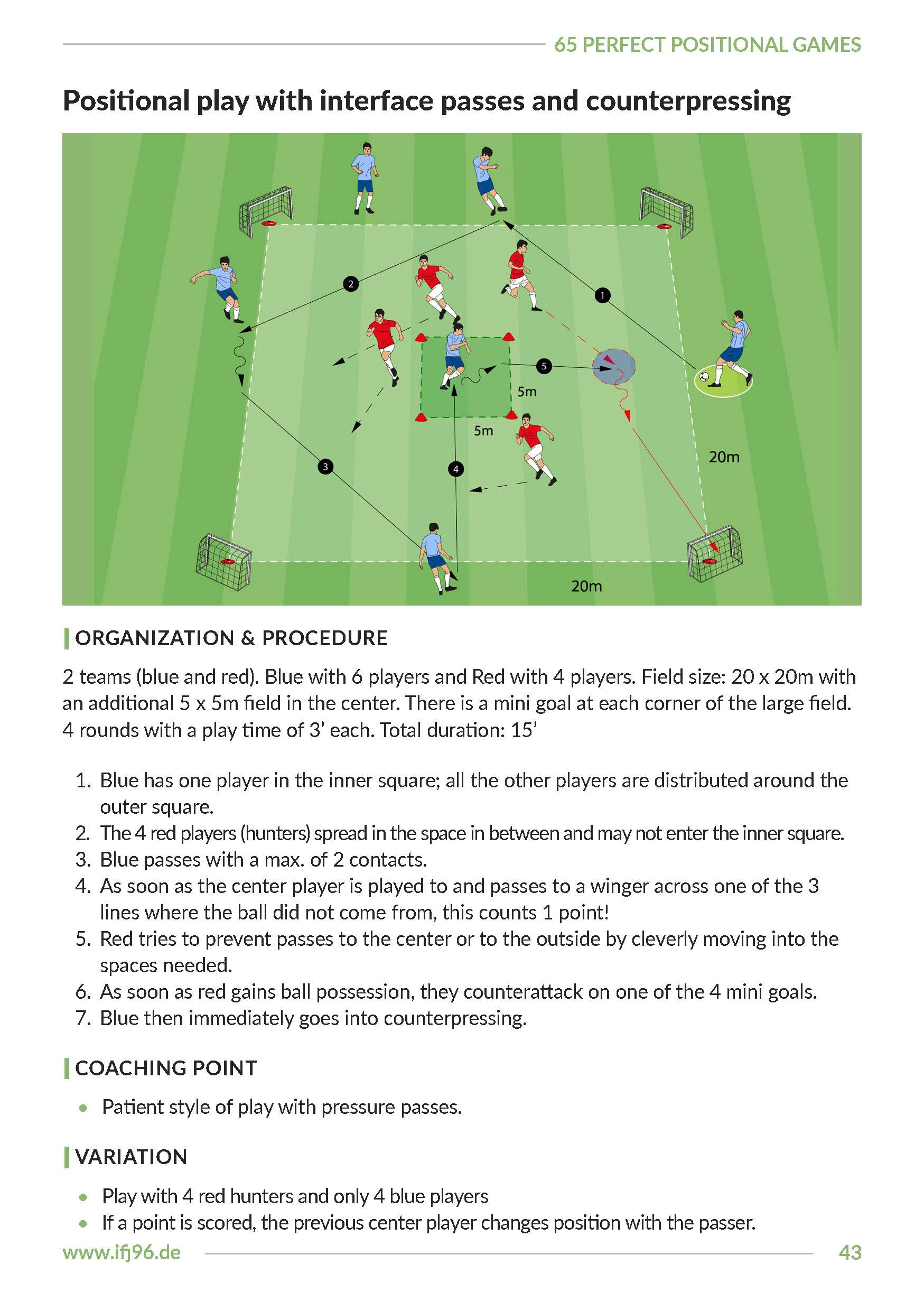 To reflect this realistically in training, positional games are particularly suitable. Positional games are possession-based exercises in equal, superior, or even inferior numbers without goals. These exercises train the ability to use available space efficiently under time and space pressure and to circulate the ball within your team. The opposing team tries to reduce space and apply pressure to win back possession.